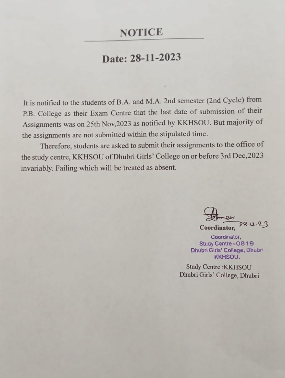 Notification for Assignment of B.A &M.A. (2nd Cycle). Last date for submission of assignments on or before 3rd Dec,2023